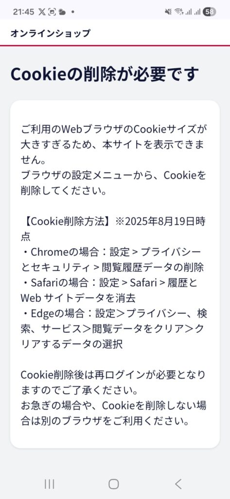 ドコモオンラインショップの[Cookieの削除が必要です]は、Cookieというやつの肥大が主因。