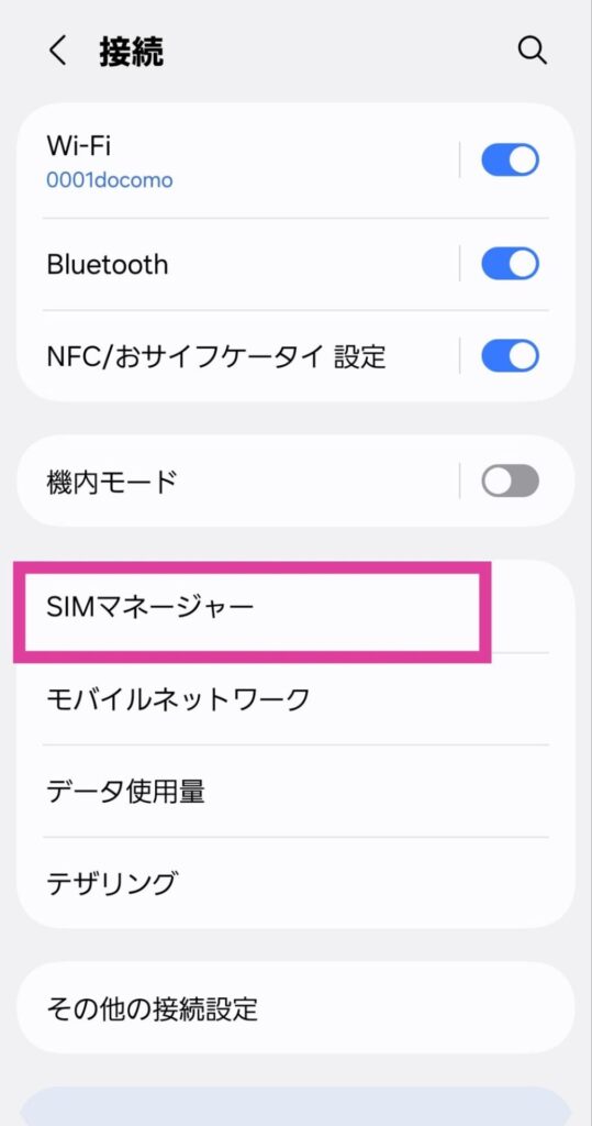 手順はシンプル。ドコモ契約ではないSIMを一時的にオフにしただけです。私のGalaxyの場合: