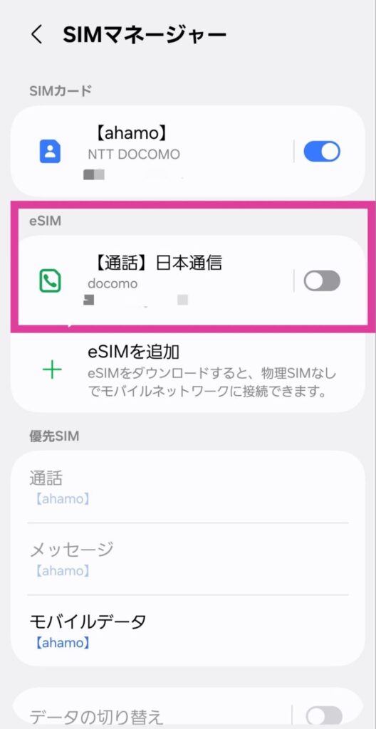 - ドコモ契約ではない側(私の場合はeSIM)をオフ
